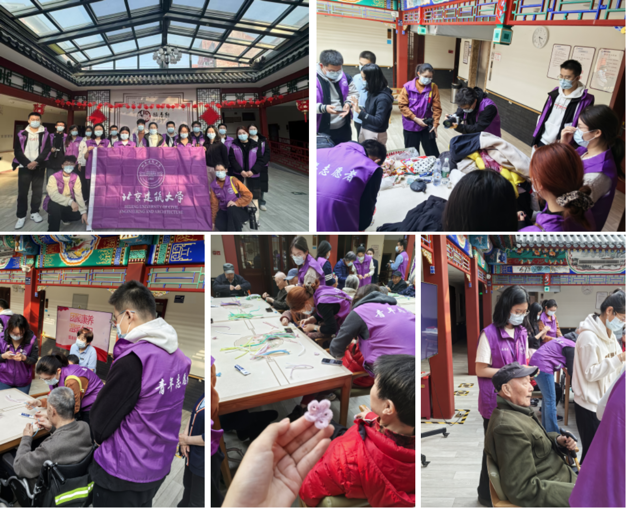建筑菁英班学生代表姚兴博、金紫原与学校团学学生骨干共同前往颐寿轩养老照料中心开展志愿服务活动,与老同志们一起围坐交谈,共同学习制作手工花束,为老同志们送去温暖与关怀。