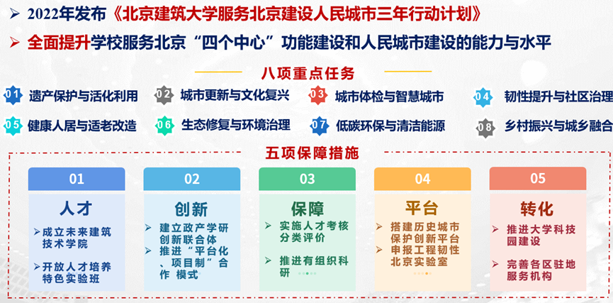 主要介绍学校在服务首都城乡建设方面的重要成果。学校将优秀文化融入建筑学教育,并获得国家教学成果一等奖,参与了天安门城楼修缮和多个历史文化街区的保护工作,负责近50%的长城保护任务,并与北京市文物局共建北京长城文化研究院。在数字化保护方面,学校使用3D打印和激光扫描技术确保文化遗产的准确修复。在城市体检、海绵城市建设和市政污水处理技术方面取得显著成果,建筑垃圾资源化技术处于领先地位。此外,还承担了国家重点研发计划项目等,展现了多个领域的优势和成就。