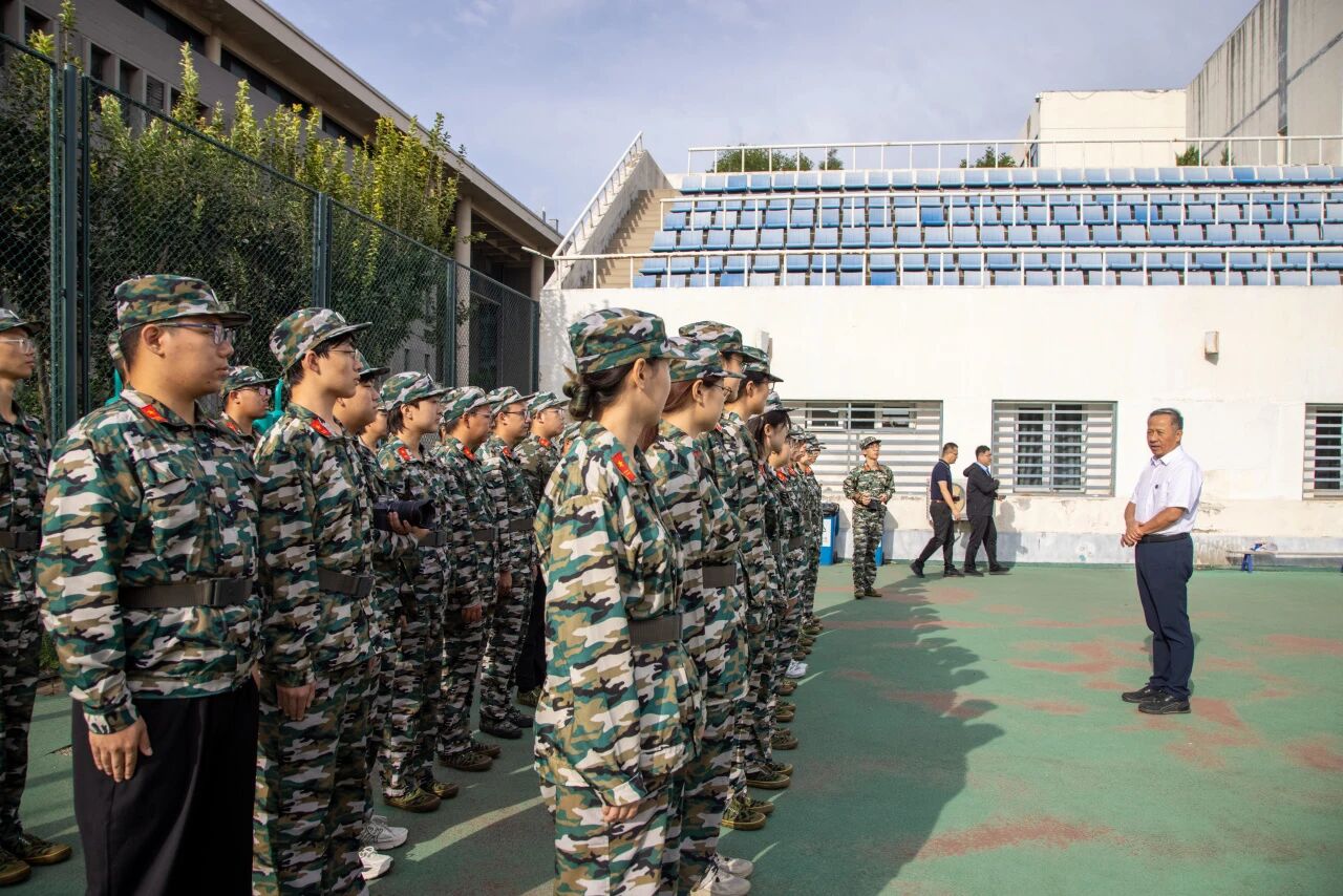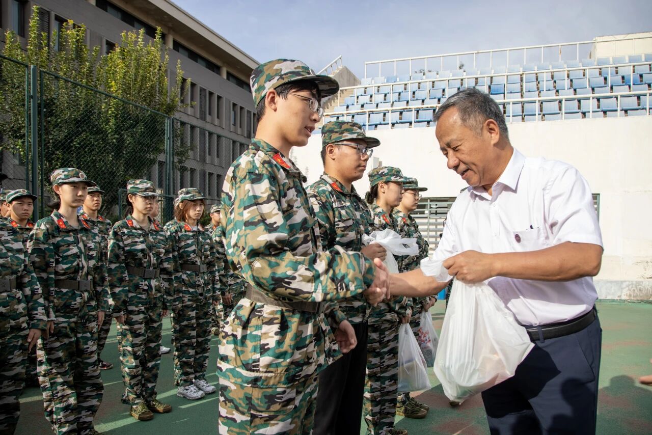 张大玉校长为参训学生代表送上慰问品,并与全体军训新生合影留念。
