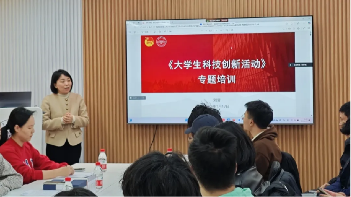 刘倩从大学生科创竞赛的背景意义、学校学生科创工作体系、大学生如何参与科创竞赛三方面展开,重点结合竞赛政策、赛事名录、参赛要求、历届案例等内容进行解读,为同学们详细讲解了学校“一心、双环、三维、四融合、五大创新实践”的大学生科创工作体系内涵。她鼓励同学们要敢于创新、勇于尝试,不断提升自己的综合素质和创新能力。
